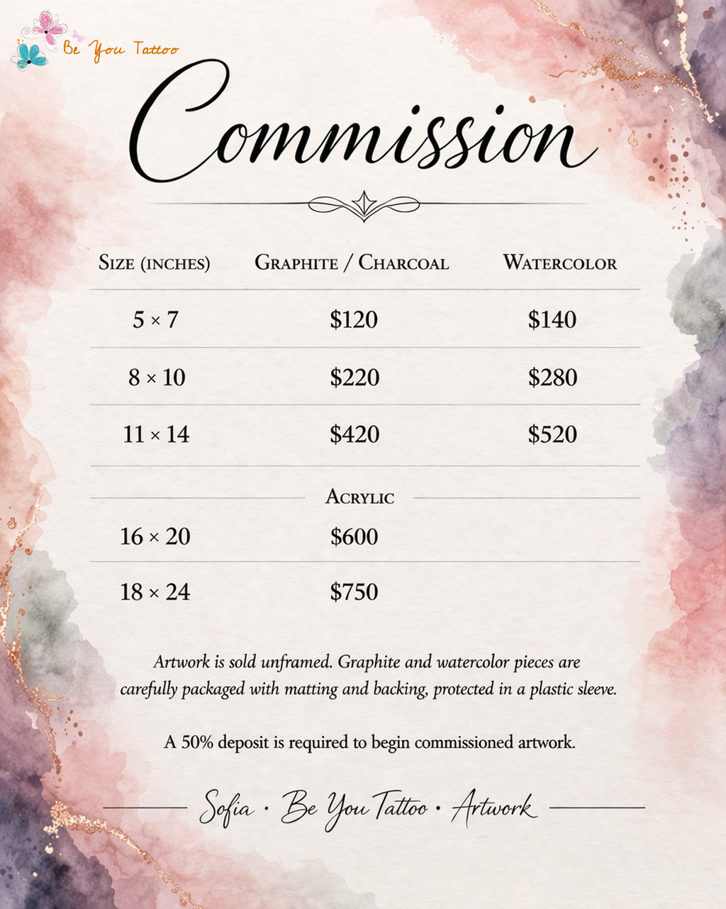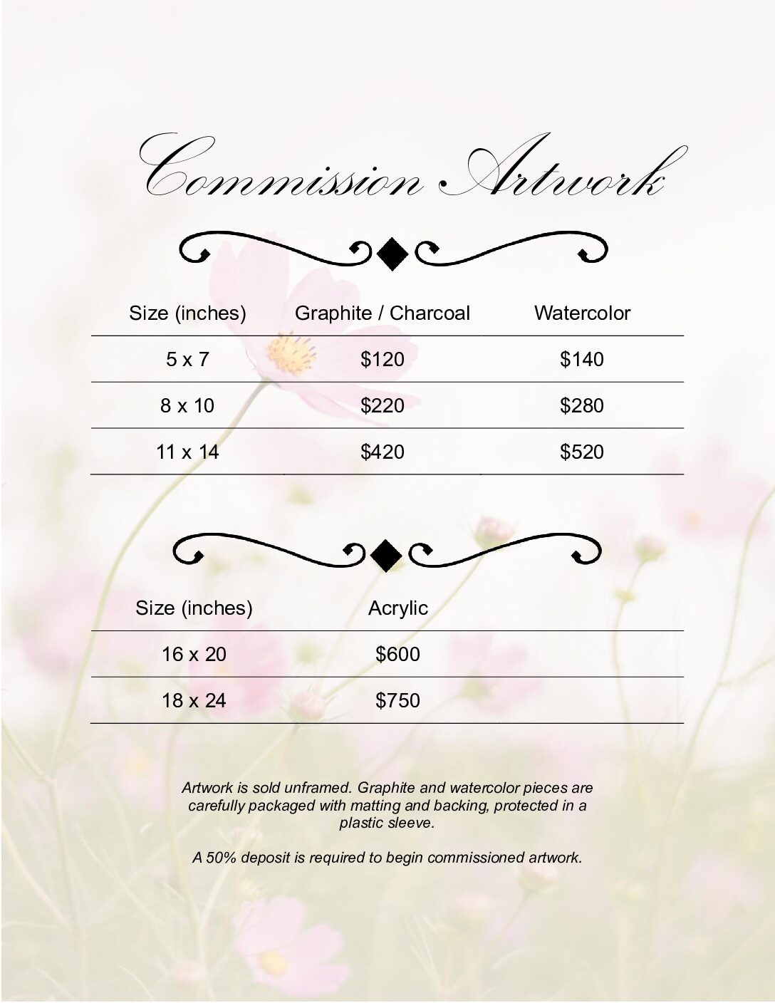 A 50% deposut is required to begin commissioned artwork.